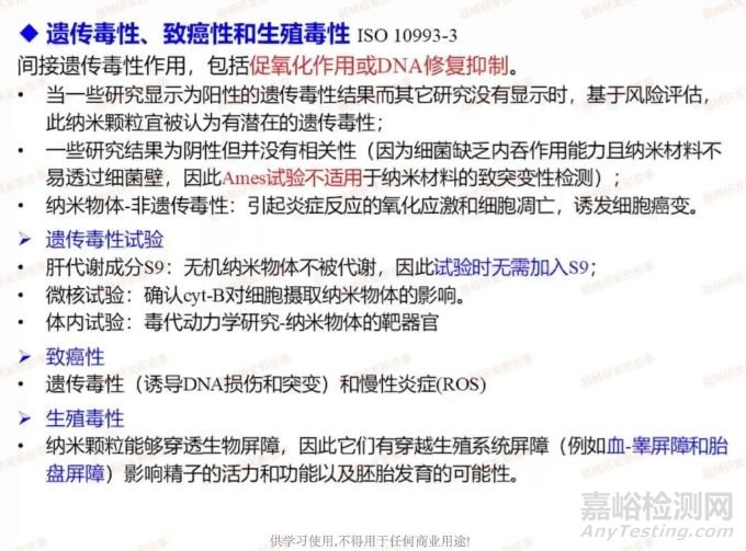 在開展體內(nèi)遺傳毒性實驗時,我們需要根據(jù)ISO 10993-16毒代動力學(xué)研究,特別關(guān)注納米物體靶器官的體內(nèi)實驗。對于致癌性實驗,除了遺傳毒性,還需關(guān)注由于DNA損傷突變引起的慢性炎癥反應(yīng)和由氧化應(yīng)激導(dǎo)致的致癌性。對于生殖毒性,我們需要強(qiáng)調(diào)納米顆粒能穿透生物屏障,因此它們可以穿透生殖系統(tǒng)屏障,從而影響精子的活力、功能以及胚胎的發(fā)育。免疫毒性方面,納米與蛋白質(zhì)結(jié)合形成蛋白冠,可被單核細(xì)胞計數(shù)系統(tǒng)吞噬。這涉及巨噬細(xì)胞、輸出狀細(xì)胞和朗格漢斯細(xì)胞。