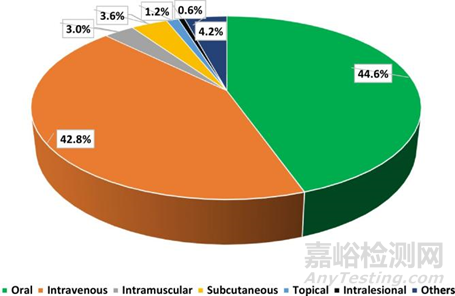 對2000年1月至2018年9月期間美國 FDA 批準的腫瘤藥物產品進行了調查。根據給藥途徑對這些藥物進行分類。圖3顯示了調查結果,在接受調查的167種腫瘤藥物產品中,口服給藥應然占據著最大的比例。口服是抗腫瘤藥物最優選的給藥途徑。它有幾個優點,例如易于管理和降低治療成本。口服給藥允許可行的連續給藥。口服化療成功的先決條件之一是獲得藥物可靠和一致的藥代動力學特征,從而實現最大的藥物療效和最小的毒性。但是一些挑戰與藥物的理化特性和胃腸道的生理學有關。這些挑戰限制了理想藥代動力學的實現,因此也限制了口服水溶性差的抗腫瘤藥物的藥效。所以也可以清楚看到,約42.8%是靜脈注射的。