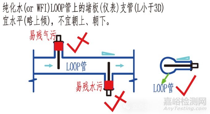 當(dāng)然 WFI(PW)循環(huán)管路上的支口做法也有講究,不僅要符合“3D”規(guī)則,而且要分析水在泵送壓力和滋生重力雙重影響下的流動規(guī)律,如果支口方向設(shè)計不當(dāng),同樣會增大微生物等污染風(fēng)險。例如,循環(huán)管路支口上帶隔膜閥的,常作為用水點,此時閥門就不宜朝上開口安裝,否則閥門關(guān)閉后上口殘留有一段死水不便排凈,此段死水易滋生微生物,在閥門再次打開后易與循環(huán)管路內(nèi)的水發(fā)生混合,不僅導(dǎo)致用水點水質(zhì)受到不利影響,而且易污染到整個循環(huán)系統(tǒng)。另外,對于循環(huán)系統(tǒng)上的有些儀表是采用堵板支口形式安裝的,這種堵板支口設(shè)計朝向不宜朝上,否則上側(cè)“盲腸”端頭處會導(dǎo)致氣體集聚,形成死氣段污染),也不宜垂直朝下,否則下側(cè)端頭易產(chǎn)生沉淀聚集,易形成死水段,增加微生物等污染風(fēng)險。