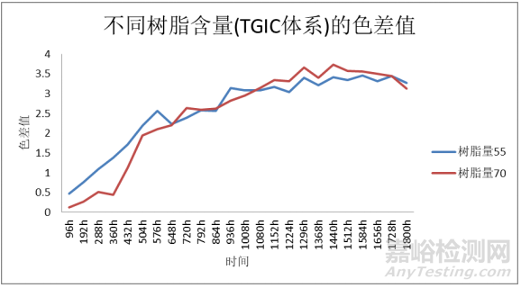 圖8 不同樹脂含量對TGIC體系的色差值影響