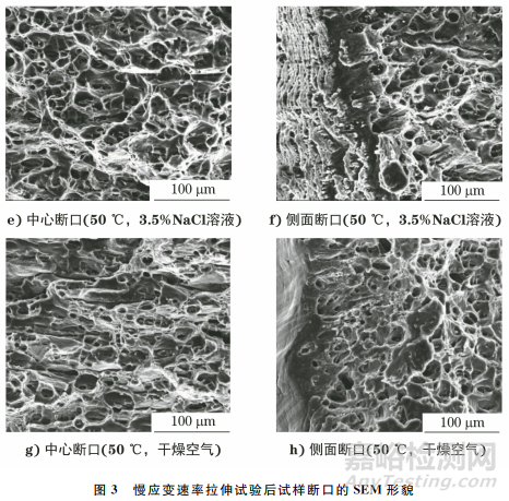經(jīng)慢應變速率拉伸試驗后,各試樣斷口的SEM分析結果如圖3所示。由圖3可知:在不同環(huán)境下,試樣斷口形貌相差不大,中心區(qū)域均呈韌窩特征,表面區(qū)域均呈剪切韌窩特征,未觀察到脆性特征和二次裂紋,表明6082鋁合金在兩種溫度下均無應力腐蝕敏感性。