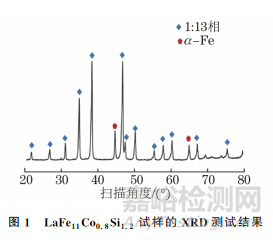 圖1為LaFe11Co0.8Si1.2試樣的XRD測試結果。由圖1可知:在1050℃下退火7d后,試樣存在少量的α-Fe雜相,其余均為La(Fe,Si)13純相組織。