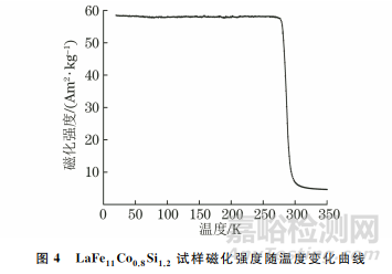 將試樣磁化強度對溫度求導,得出dM/dt與溫度t的關系曲線,如圖5所示。由圖5可知:當dM/dt最小時,材料的磁化強度隨溫度變化得最快,此時試樣發生了鐵磁向順磁轉變,以該溫度為材料的居里溫度,計算得出LaFe11Co0.8Si1.2試樣居里溫度為288K。