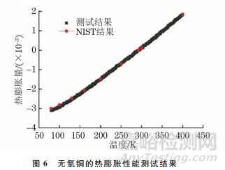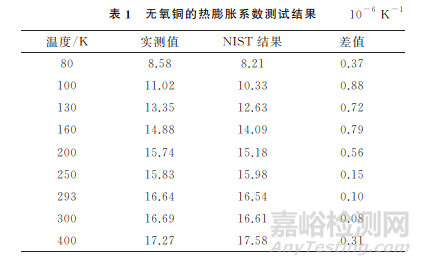 為保證測量結果的可靠性,測試無氧銅(純度為99.999%)的熱膨脹系數,并與美國國家標準與技術研究院(NIST)發表的Cu熱膨脹系數進行對比,評估采用應變片法測試材料熱膨脹性能結果的準確度。在溫度為 80~400K的條件下對無氧銅的熱膨脹性能進行測試,結果如圖6所示。由圖6可知:測試結果與NIST結果基本重合。無氧銅的熱膨脹系數測試結果如表1所示,以293K為基準溫度,將無氧銅的熱膨脹系數與NIST結果進行對比,最大誤差為8.8×10-7K-1,最大偏差為8.52%。