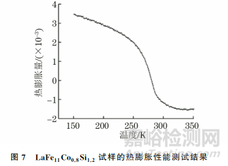 利用上述方法對LaFe11Co0.8Si1.2試樣進行熱膨脹性能測試,結果如圖7所示。由圖7可知:LaFe11Co0.8Si1.2試樣熱膨脹量隨溫度的降低而增加,發生了負熱膨脹現象,負熱膨脹溫區寬度為260~330K。試樣在降溫過程中,原子的非簡諧振動會使材料表現出正常的熱脹冷縮,然而當溫度降低至居里溫度時,試樣性能由順磁性變為鐵磁性,即發生了巡游電子變磁轉變,這個過程中磁有序導致的磁致伸縮作用抵消了材料原子非簡諧振動引起的熱脹冷縮,當磁致伸縮作用繼續增大時,材料表現出反常的熱縮冷脹,即發生了負熱膨脹。