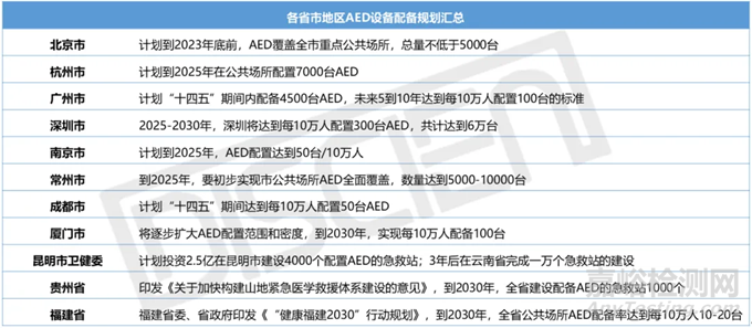 近幾年,《健康中國行動(2019-2030)》、《公共場所自動體外除顫器配置指南(試行)》、《十四五健康老齡化規(guī)劃》等國家文件接連要求“在人流密集場所配置AED設(shè)備”,各省市迅速響應(yīng),迎來了深圳、北京、杭州等10余省市密集下發(fā)配置規(guī)劃的盛況。