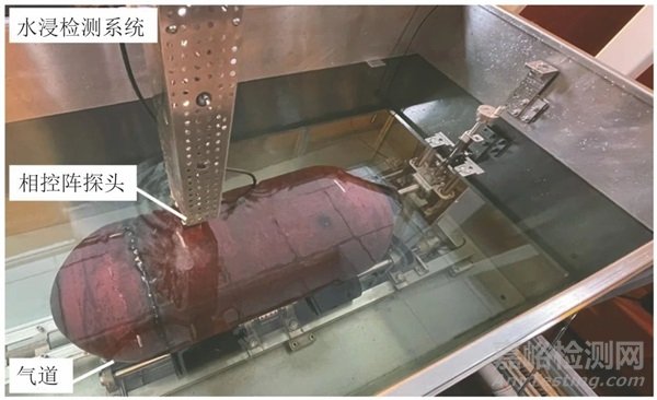 采用五軸聯動相控陣超聲水浸C掃描自動檢測系統對加工內外表面刻槽的瓶體試件進行檢測試驗(為模擬完整氣瓶,將割開后加工表面刻槽的兩部分瓶體重新焊在一起)。檢測現場如圖9所示。