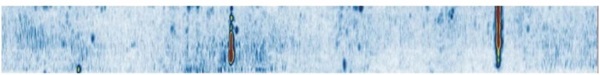 對瓶體筒身軸向缺陷,通過調節偏心距使入射聲束在鋼瓶中產生純橫波進行檢測,相控陣C掃描結果如圖10所示,圖中可清晰看到條狀的特征圖像(代表內外表面的刻槽)。