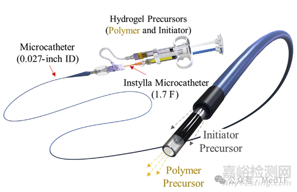 PEG溶劑和引發(fā)劑溶劑分別通過注射器同時(shí)向兩根微導(dǎo)管內(nèi)注射,當(dāng)兩種溶液通過微導(dǎo)管到達(dá)血管后,引發(fā)劑將引發(fā)PEG聚合,形成一個(gè)高度交聯(lián)的柔軟水凝膠,從而完全填充預(yù)栓塞的血管。根據(jù)Instylla介紹Embrace HES的水凝膠在6月內(nèi)能夠被人體降解吸收,降解產(chǎn)物通過腎代謝排除體外。