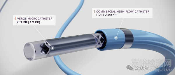 輸送系統(tǒng)由兩根同軸的微導(dǎo)管組成,外導(dǎo)管內(nèi)徑≥0.027英寸,內(nèi)導(dǎo)管內(nèi)徑1.2Fr、外徑1.7Fr。