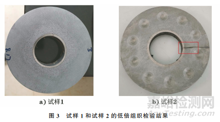 對試樣1和試樣2進(jìn)行低倍組織檢驗(yàn),結(jié)果如圖3所示。由圖3可知:試樣1和試樣2的基體組織致密,冶金質(zhì)量良好。