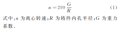 轉(zhuǎn)速是離心澆鑄的重要參數(shù)。過高的轉(zhuǎn)速會加大對設(shè)備精度的要求,以保證管內(nèi)壁厚均勻一致;設(shè)備易產(chǎn)生振動以及較大的離心力,使凝固后的合金產(chǎn)生裂紋;合金層元素組成不同,導(dǎo)致偏析現(xiàn)象嚴(yán)重。過低的轉(zhuǎn)速不利于金屬粉末的凝固結(jié)合,易產(chǎn)生氣孔、疏松等缺陷。離心澆鑄轉(zhuǎn)速公式如式(1)所示。