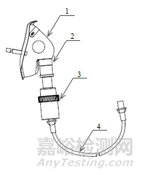典型面罩式氣流霧化器產品通常由罩體(面罩)、霧化杯、連接管和接口組成,其結構示意圖及實物照片(圖1)如下所示。