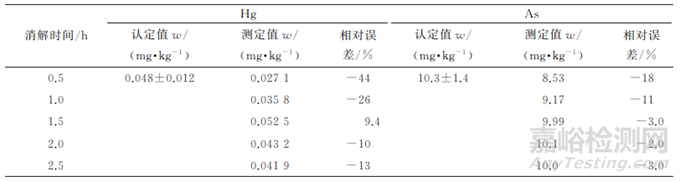 表2 不同消解時間下汞、砷的測定結(jié)果
