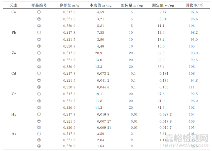 由表8可知,7種元素的回收率為92.5% ~111%,滿足實驗室分析要求。