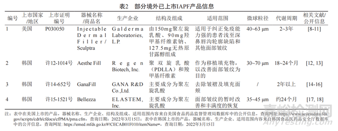 注射填充劑在我國按照第三類醫療器械進行管理。經在國家藥品監督管理局(National Medical Products Administration,NMPA)網站查詢,當前共計有前述的 3 個 IAPF 產品在我國批準上市,其中包括 2 個國產產品和 1 個進口產品。產品具體信息見表 1。除上述三款器械外,還有部分 IAPF 產品在中國處于臨床試驗階段或研發階段。通過其他國家藥監部門網站、生產企業官方網站信息查詢,收集到部分在境外上市的 IAPF 產品,具體信息見表 2。
