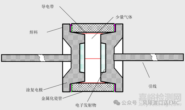 為保證氣體放電管能快速地將浪涌電壓限制在低電位,在陶瓷絕緣管內(nèi)表面制作導電帶,通過作用電場來加速放電區(qū)域的電離,使氣體放電管具有快速響應特性和可恢復性。