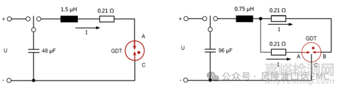 測量時,施加的沖擊電流數(shù)值大小根據(jù)GDT規(guī)格書確定,對于兩極的GDT,產(chǎn)生8/20us波形的試驗電路如上圖左圖所示,沖擊電流測量應有足夠長時間間隔不至于GDT內(nèi)部發(fā)熱。對于三極GDT,每個電極應同時向公共電極放電如上圖左圖所示,各自標稱沖擊電流的規(guī)定值如規(guī)格書,完成規(guī)定的電流次數(shù)后,測量GDT直流擊穿電壓、脈沖擊穿電壓及絕緣阻抗應符合規(guī)格書所規(guī)定的值。