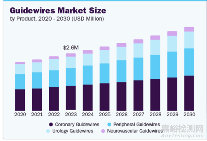 全球導(dǎo)絲市場的規(guī)模在2023年估計為25.8億美元,并預(yù)計從2024年至2030年將以5.5%的復(fù)合年增長率增長。導(dǎo)絲行業(yè)增長的主要因素是泌尿系統(tǒng)疾病、外周動脈疾病(PAD)和心血管疾病(CVD)的增加。例如,根據(jù)PCR在線的數(shù)據(jù),CVD仍然是全球男性和女性死亡的主要原因。截至2023年,全球人口約為80億人,其中大約有6.2億人患有心臟和循環(huán)系統(tǒng)疾病。每年,全世界大約有6千萬人新發(fā)心臟或循環(huán)系統(tǒng)疾病。