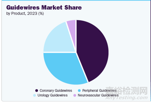 導(dǎo)絲行業(yè)展現(xiàn)出高度的創(chuàng)新性,例如,技術(shù)進步已經(jīng)徹底改變了泌尿科導(dǎo)絲,使其具備足夠的柔韌性和潤滑性來通過扭曲的輸尿管并穿過可能存在的阻塞。奧林巴斯(Olympus)的E-Z Glider、Quattro、PTFE涂層、Bentson和Amplatz泌尿科導(dǎo)絲確保了扭矩、潤滑性和可視性的最佳組合,通過提供各種尺寸、核心材料、涂層和尖端設(shè)計來實現(xiàn)最佳效果。所有這些導(dǎo)絲都設(shè)計用來確保順暢追蹤、快速進入和最大靈活性。波士頓科學(xué)(Boston Scientific)的Zebra泌尿科導(dǎo)絲具有抗扭結(jié)的鎳鈦合金核心和PTFE涂層外層,以及鉑金遠端尖端以提供視覺反饋。這些發(fā)展預(yù)計會為行業(yè)參與者帶來有利可圖的增長機會。