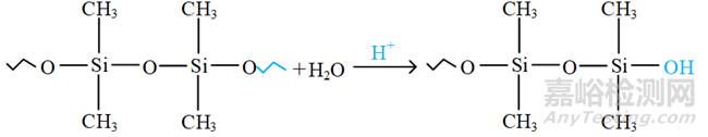 引起硅橡膠老化的其他酸性環(huán)境因素包括酸(鹽酸外)、臭氧和氮氧化物,例如氮氧化物可吸收水分轉(zhuǎn)化為硝酸。已有研究表明,絕緣子長(zhǎng)時(shí)間服役于強(qiáng)酸性環(huán)境,其表面會(huì)在酸的影響下被嚴(yán)重破壞。酸性物質(zhì)會(huì)使硅橡膠主鏈上的極性Si-O鍵斷裂,生成極性Si-OH鍵,下圖為反應(yīng)化學(xué)過(guò)程。酸性環(huán)境下硅橡膠的老化反應(yīng)與表面Si-C鍵和C-H鍵斷裂不同,主鏈斷裂生成的Si-OH鍵具有親水性,會(huì)導(dǎo)致硅橡膠材料疏水性嚴(yán)重下降。