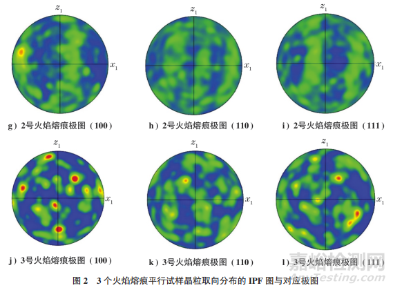 3個火焰熔痕平行試樣晶粒取向分布的二維赤道平面投影(IPF)圖如圖2a)~2c)所示。由圖2a)~2c)可知,火焰熔痕以粗大的枝晶或者等軸晶為主,晶粒取向分布呈無序狀態(tài)。圖2d)~2l)為圖2a)~2c)的極圖。由圖2d)~2l)可知,火焰熔痕的取向分布較為雜散,沒有出現(xiàn)明顯的織構(gòu)特征。