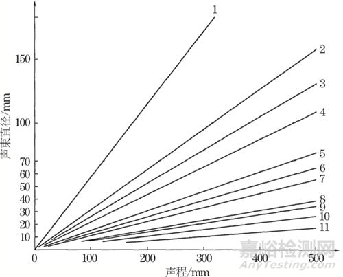 圖1 各種聲程和近場長度的探頭對應的聲束直徑 (GB/T 7233.1—2023圖C.1)