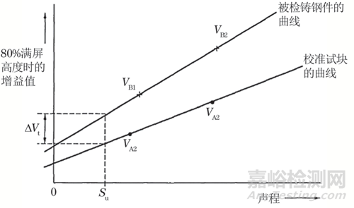 另外,如采用標準GB/T 39242中比較法測定傳輸修正值,如圖4所示(圖中VA1,VA2分別為校準試塊一次底波和二次底波達到基準波高時的增益值;VB1,VB2分別為被檢鑄鋼件一次底波和二次底波達到基準波高時的增益值;?Vt為聲程為Su時傳輸修正值),兩直線的斜率分別為被檢鑄鋼件和標準試塊的衰減系數,當聲程為零時兩直線的偏差僅由耦合差異引起,即兩直線在縱坐標上的截距之差便為試塊和工件之間的耦合衰減值。