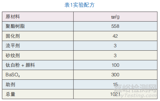 聚酯樹脂:SJ4#E 工業品,市售;固化劑:TGIC,工業品,市售;流平劑 :GLP588,工業品,市售;砂紋劑:工業品,市售;鈦白粉:R902,市售;BaSO4:工業品,市售;助劑:工業品,定制。
