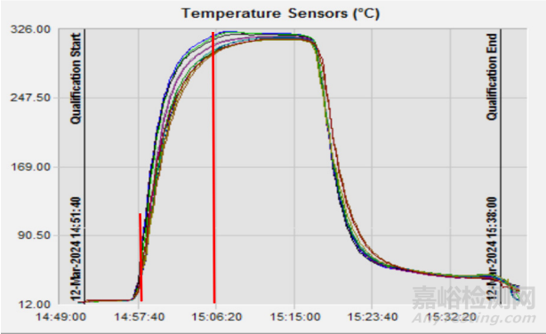 圖7、圖8 分別為對隧道烘箱測試時采用熱風為 320℃,風速 0.45m/s工況時的實際試驗現(xiàn)場圖,以及所獲得的不同測點的溫度溫升曲線圖,由圖8 可知,烘箱溫度要達到 300℃需要約 8 min 左右,該值與仿真模擬值相比略大,主要原因在于模擬時簡化為單個西林瓶在穩(wěn)定風溫風速下的受熱情況,沒有考慮到烘箱的結(jié)構(gòu)、瓶子的排列方式及預(yù)熱段、冷卻段對加熱段的影響。但是,仿真分析出的西林瓶升溫趨勢及受熱情況對實際生產(chǎn)具有相當大的參考價值,對風溫、風速及網(wǎng)帶運行速度的合理選擇具有重要的指導(dǎo)作用。