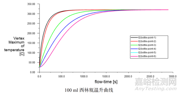選取西林瓶瓶口上部(Bottlepoint-1)、西林瓶頸部(Bottle-point-2)、西林瓶瓶身中部(Bottle-point-3)、西林瓶瓶內(nèi)邊緣(Bottle-point-4)、西林瓶瓶內(nèi)底中心(Bottle-point-5)、西林瓶瓶底中心(Bottle-point-6)六個測點跟蹤其溫升曲線,如圖3 所示。