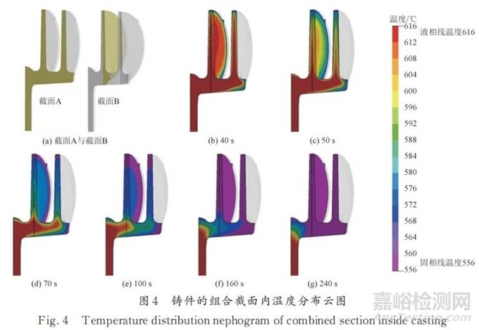通過Visual-Environment后處理程序?qū)崿F(xiàn)Pro?CAST鑄造模擬。對澆注系統(tǒng)進(jìn)行設(shè)計,澆口上方添加半圓球狀的緩沖區(qū)域,更利于鑄件實(shí)現(xiàn)順序凝固。圖4為鑄件的組合截面內(nèi)溫度分布云圖。可以看出,遠(yuǎn)離澆口比靠近澆口處的金屬液先凝固,鑄件內(nèi)沒有孤立的熱節(jié)區(qū)域,熱節(jié)轉(zhuǎn)移至半球狀區(qū)域下方避免鑄件缺陷。