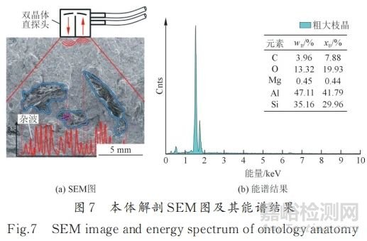 根據(jù)鑄造仿真結(jié)果,反重力吸鑄完成制動盤盤體制備后,對盤體面采用超聲掃描進(jìn)行探傷,掃描過程中未發(fā)現(xiàn)裂紋、縮松等缺陷,但局部成像顯示密集型草狀雜波,因此對該部位標(biāo)記并進(jìn)行本體解剖取樣分析。圖7為解剖后的SEM斷口形貌及其能譜分析。從圖7a可以看出,斷口截面存在顏色較深的片狀異常組織,放大后為羽毛狀粗大孿晶組織。表1為A356.2鋁合金化學(xué)成分。對比圖7b和表1,并考慮到實(shí)際生產(chǎn)過程中的偏差及試驗(yàn)誤差,確定其組織成分與SiCp/A356復(fù)合材料成分相當(dāng);攪拌鑄造法制備SiCp/Al復(fù)合材料時,由于其制備溫度較高,致使復(fù)合材料中晶粒粗大[13]。在不發(fā)生界面反應(yīng)前提下,盡量提升復(fù)合材料熔體溫度以保證其整體流動性,因此在較高的成形溫度下,毛坯內(nèi)部局部易出現(xiàn)粗大枝晶。