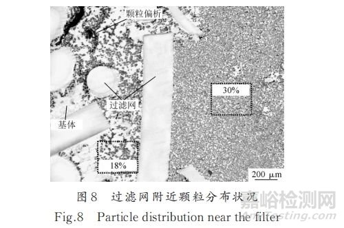 液相制備鋁基復(fù)合材料方法中常用物理過濾法除渣。長時間吸鑄過程中SiC顆粒會逐步沉積至爐底,致使?fàn)t底余料中顆粒含量提升,即生產(chǎn)的鋁基復(fù)合材料制動盤盤體內(nèi)SiC顆粒含量相對降低;攪拌鑄造法中SiC顆粒不能有效地隨著鋁合金基體熔液穿過濾網(wǎng)進(jìn)入另一側(cè)。對過濾系統(tǒng)取樣分析,發(fā)現(xiàn)過濾網(wǎng)前沿顆粒堆積,采用蔡司Stemi 508光學(xué)顯微鏡提取SiCp物相[8],顆粒體積分?jǐn)?shù)達(dá)30%,余下顆粒隨熔體進(jìn)入金屬型腔,致使汽車制動盤盤體內(nèi)部SiC顆粒含量降至18%,低于材料技術(shù)規(guī)范(顆粒體積分?jǐn)?shù)為19%~21%),見圖8。