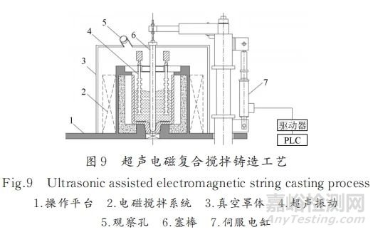 為解決粗大枝晶和顆粒堆積問題,將機(jī)械攪拌工藝改為超聲振動和電磁攪拌的復(fù)合攪拌工藝來制備鋁基復(fù)合材料,見圖9。將預(yù)處理過的干燥SiC顆粒加入640℃鋁熔體中,在混合初期打開超聲振動裝置(第1振動頻率為10kHz,第1振動功率為1kW),打開電磁攪拌調(diào)節(jié)轉(zhuǎn)速至150~300r/min,并關(guān)閉加熱系統(tǒng)維持30min。降溫過程中調(diào)節(jié)超聲振動裝置(第2振動頻率為20kHz,第2振動功率為2kW),電磁攪拌控制轉(zhuǎn)速為300~500r/min,維持1h的半固態(tài)超聲攪拌實(shí)現(xiàn)復(fù)合制備。