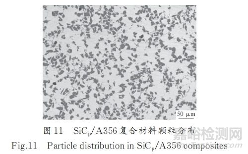 (3)以超聲輔助電磁攪拌的復(fù)合方法代替機(jī)械攪拌法,破碎枝晶并細(xì)化晶粒。對比兩種方法下盤體內(nèi)SiC顆粒體積分?jǐn)?shù),在同樣澆注參數(shù)下,SiC顆粒在濾網(wǎng)前沿堆積造成產(chǎn)品內(nèi)部體積分?jǐn)?shù)降至18%,經(jīng)過超聲毛細(xì)管效應(yīng)SiC顆粒更容易穿過濾網(wǎng),保證了基體中顆粒體積分?jǐn)?shù)達(dá)到20%,SiC顆粒隨著超聲、電磁攪拌進(jìn)一步均勻分布于基體A356合金之中。