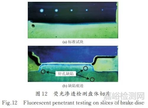 圖10為分體式實(shí)心汽車制動盤實(shí)體,未觀察到密集型草狀雜波,同時盤體內(nèi)取樣并通過光學(xué)顯微鏡觀察,根據(jù)按GB/T 32496-201確認(rèn)盤體內(nèi)SiC顆粒體積分?jǐn)?shù)為20%。對比機(jī)械攪拌制備下因過濾網(wǎng)前沿顆粒堆積造成鑄件內(nèi)部SiC顆粒體積分?jǐn)?shù)僅有18%,超聲電磁復(fù)合攪拌工藝確保了基體顆粒體積分?jǐn)?shù)符合要求,同時顆粒均勻分散,見圖11。對盤體進(jìn)行切片處理,對截面缺陷進(jìn)行分析,見圖12。發(fā)現(xiàn)切片截面上存在φ(0.3~0.8)mm的針孔,無明顯的熱節(jié)縮松缺陷,符合技術(shù)條件要求,且后期縮比制動試驗(yàn)中也未出現(xiàn)因此產(chǎn)生的裂紋,進(jìn)一步驗(yàn)證了盤體鑄造工藝的可靠性。綜上,采用超聲電磁復(fù)合攪拌工藝得到了合格汽車制動盤。