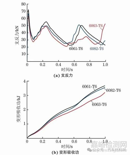 圖6 模擬得到6061-T6、6063-T6和6082-T6鋁合金方形薄壁梁在壓潰過程中的支反力和變形吸收功變化曲線