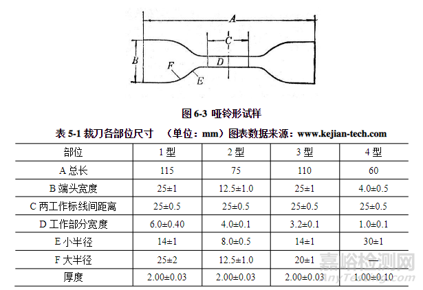 1. 硫化完成的是試片,在室溫下停放6小時,選用標準裁刀切出啞鈴型試樣,裁刀分為4種類型,其中1型為通用型,根據膠料的具體情況選用適當好的裁刀。裁刀各部分具體尺寸見圖6-3和表5-1。