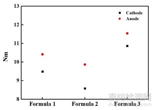 由上圖可知,正極極片和負極極片在電解液中的麥克馬林數均為:配方2<配方1<配方3。當采用電化學方法測量曲折度時,先測試獲得的有效電導率或者有效擴散系數更符合電池實際情況,不僅包含電極微觀結構信息,還包括電解液的物性特征,比如電解液的粘度和表面張力不相同會導致電解液浸潤性不同,可能出現實際部分納米孔隙內沒有電解液的情況,會導致離子傳輸路徑變遠,阻礙鋰離子在正負極之間的穿梭,從而影響電池的倍率性能、放電容量和使用壽命。電解液的組成和鋰鹽濃度會改變粘度和表面張力,進而影響潤濕性。通過改善注液工藝、改善卷芯工藝、添加電解液浸潤劑等方法可以提高電解液的浸潤效果。此外,電解液中的添加劑也可以通過改變Li+溶劑化結構,從而影響電池性能。