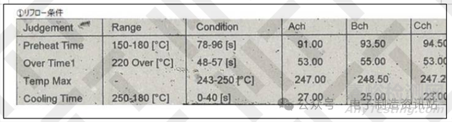 如圖7所示,由profile曲線可知,預(yù)熱時(shí)間(150℃-180℃)最大為94.50s,回流時(shí)間(>220℃)最大為55.00s,峰值溫度最高為248.5℃,參考標(biāo)準(zhǔn)IPC/JEDEC J-STD-020E-2015非氣密固態(tài)表面貼裝器件的潮濕/再流焊敏感度分類中對回流焊溫度要求,爐溫設(shè)置正常,未表現(xiàn)出熱輸入過量特征。