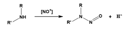 反應(yīng)性亞硝化劑有多種潛在來(lái)源,可作為亞硝胺前體(表4)。 腫胺的亞硝化通常被描述為胺與亞硝酸陽(yáng)離子(NO+)或三氧化二氮(N2O3)的反應(yīng),兩者都可以與亞硝酸平衡存在。 胺的亞硝化依賴于pH,在酸性條件下(pH 3-4)通常更快。 酸性溶液中最常見(jiàn)的反應(yīng)途徑是通過(guò)亞硝酸和仲胺。然而,也描述了自由基途徑與NO/O2和原位生成硝基鹽的反應(yīng)。 此外還報(bào)告了醛催化亞硝化的情況。在機(jī)理上提出醛類催化劑與二羥基胺發(fā)生反應(yīng),形成亞胺類。 亞硝酸鹽添加到亞胺中間體形成亞硝酰供體,亞硝酰供體可與另一當(dāng)量仲次胺反應(yīng)形成亞硝胺并生成醛催化劑。 這種途徑即使在中性或堿性介質(zhì)中也可以允許亞硝化。