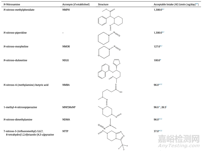 表7:個(gè)別監(jiān)管機(jī)構(gòu)公布的藥物產(chǎn)品中亞硝胺雜質(zhì)的可接受攝入量限制的例子(不一定適用于所有國(guó)家和地區(qū))