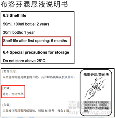 示例2:以布洛芬混懸液為例,說明書中明確規定,貯藏在25℃以下的室溫,啟封后6個月內可使用。