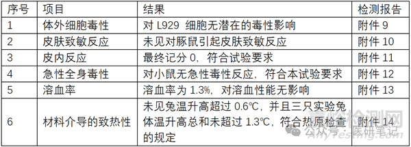 根據現行版標準,申報產品進行了細胞毒性、致敏反應、刺激或皮內反應、材料介導的致熱性、急性全身毒性和血液相容性研究,標注陰影部分表示,詳見表2。