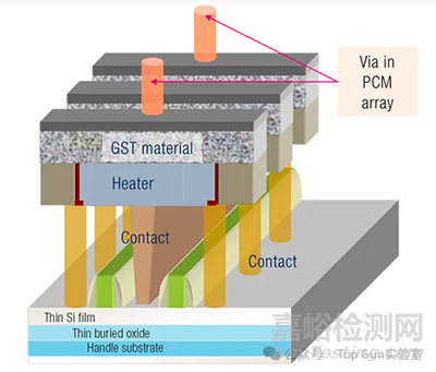 PCM的顯著特點(diǎn)是薄膜層的電阻變化與材料在晶態(tài)和非晶態(tài)之間的熱致相變有關(guān),非晶態(tài)具有高電阻率,而晶態(tài)具有顯著較低的電阻率。在PCM中,熱刺激由施加在兩個(gè)電極之間的電脈沖提供,這兩個(gè)電極與位于它們之間的相變材料直接接觸,電脈沖的形狀和幅度決定了相變層是轉(zhuǎn)變?yōu)榉蔷B(tài)還是晶態(tài),存儲(chǔ)器的狀態(tài)是通過在低電場(chǎng)下測(cè)量其電阻來確定。PCM陣列截面圖如下圖所示。