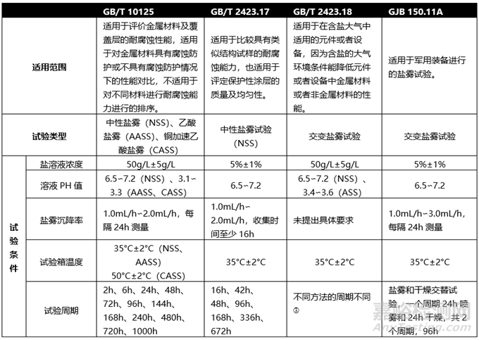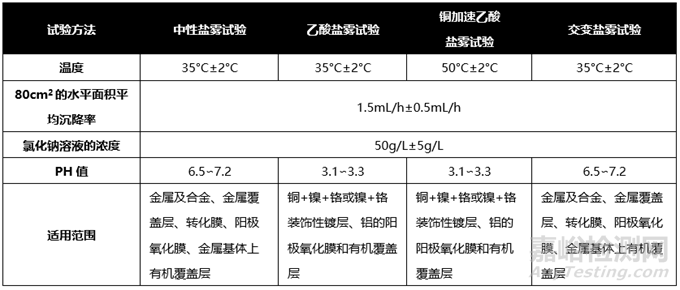 四種鹽霧試驗(yàn)的對比列表