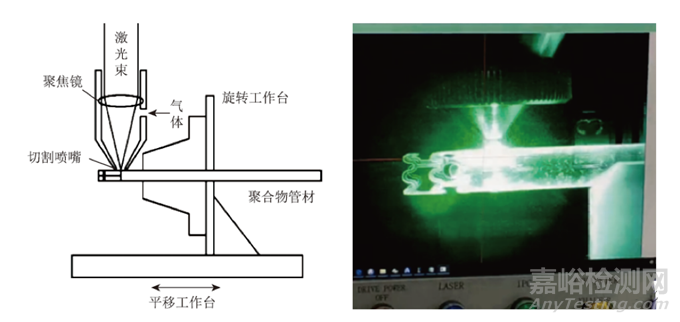國際上大多數公司的研制工作通常都是利用螺桿擠出機將原料熔融擠出制備管材,再對管材進行激光切割以制成最終的支架產品。其中,塑料擠出成型是用加熱的方法使塑料成為流動狀態,然后在一定壓力作用下使其通過塑模,經定型后制得連續的型材。擠出成型具有效率高、投資少、制造簡便、可連續化生產等優點。聚合物血管支架的擠出-切割原理與金屬支架的擠出-切割原理類似,其具體原理和過程如圖所示: