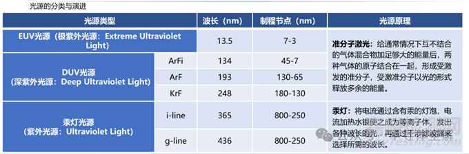 光刻機的發展是伴隨著工作波長的減少進行的。最早的光源是紫外光源(UV,Ultra-Violet),由汞燈產生波長436nm的g-line激光、405nm的h-line激光與波長365nm的i-line激光。