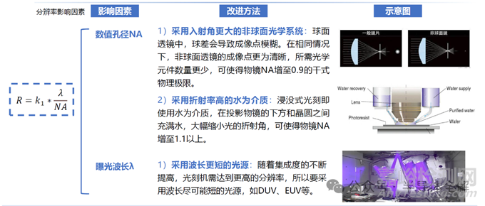 分辨率改進方法:1)增大數值孔徑;2) 縮短曝光波長;3) 縮小光刻工藝參數。